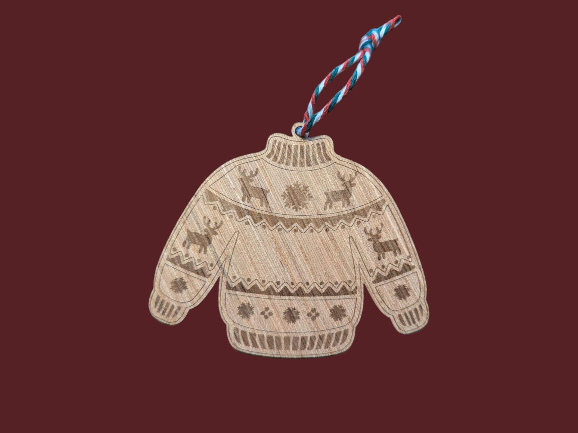 Leuke houten kerstbal in de vorm van een trui.
